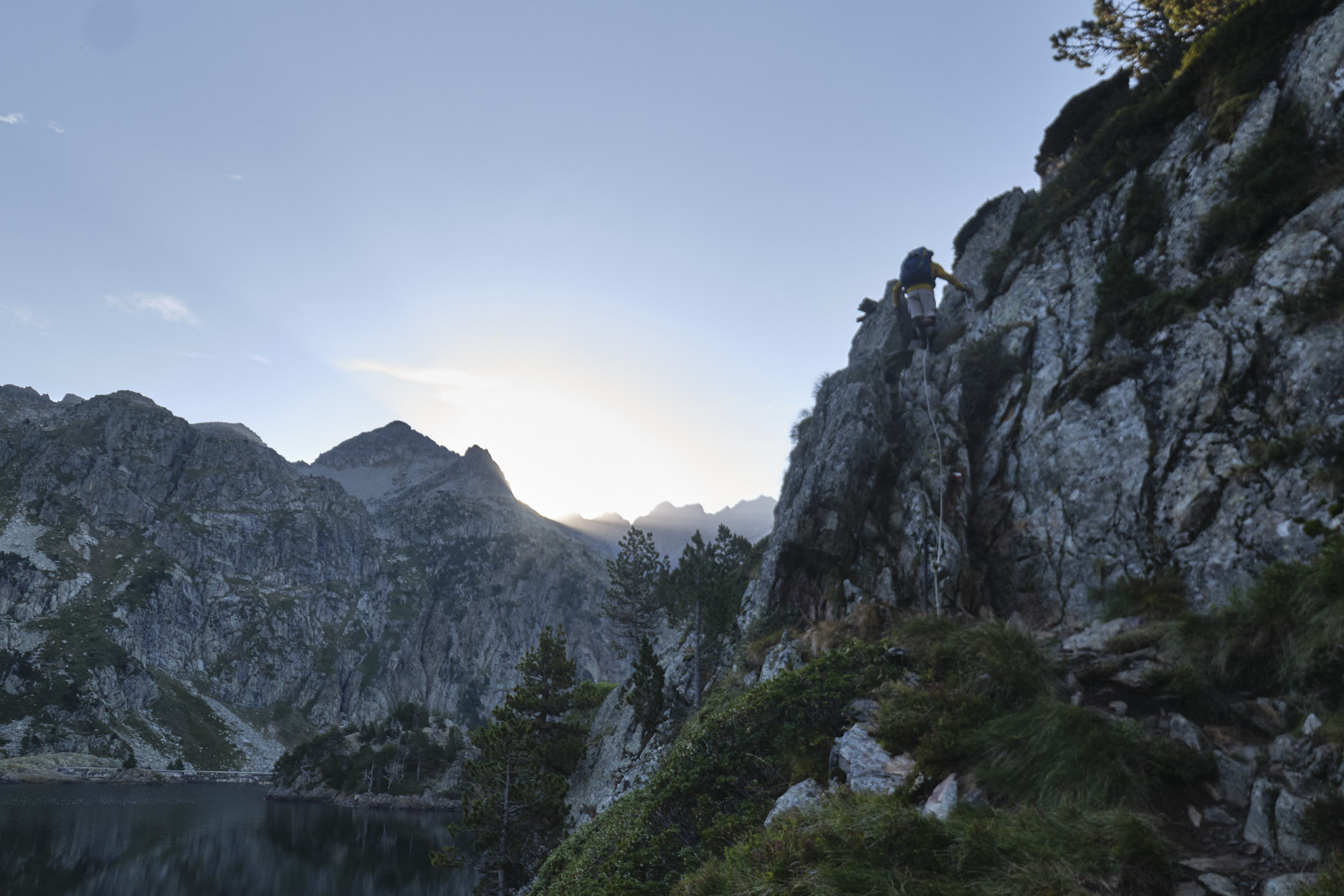Équipement et matériel mini section équipée le long de l'étang de Romedo Dalt, quelques barreaux et câbles sous le Malcaras